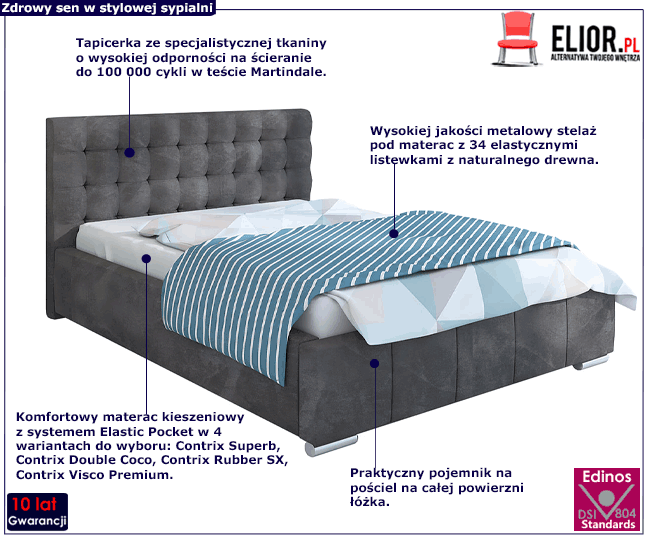 - Łóżko wyposażone jest w pojemnik na pościel, stelaż metalowy na gazowych podnośnikach, oraz wysokiej jakości nowoczesny materac do wyboru.