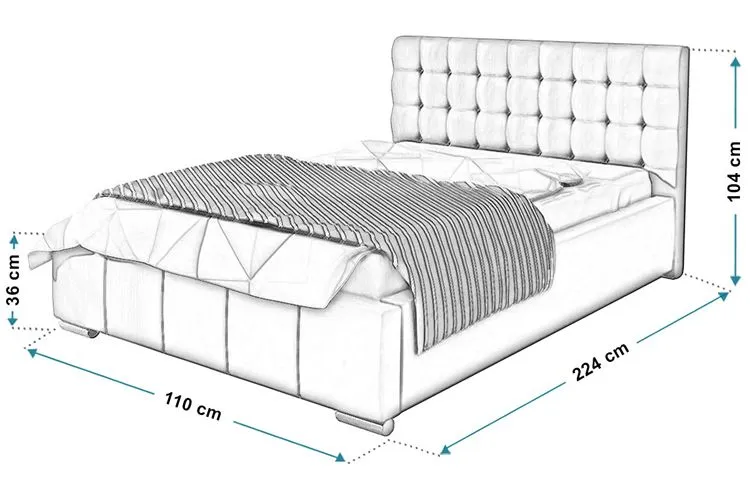 - Wymiary łóżka: długość: 224 cm, szerokość: 110 cm, wysokość zagłowia: 104 cm, wysokość materacy: 17 -19 cm.