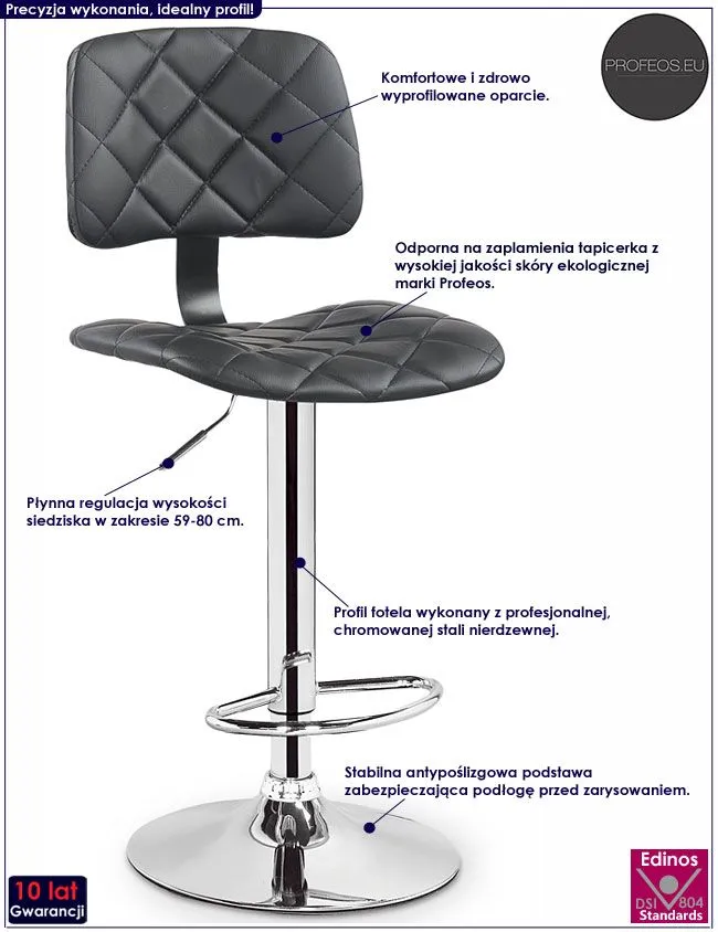Komfortowy hoker Gursel wyróżnia się nie tylko swoją unikalną formą, ale także zastosowaniem materiałów najlepszej jakości. Designerska pikowana tapicerka mebla wykonana została z najwyższej jakości ekoskóry (skóry ekologicznej), łatwej do utrzymania w czystości. Ekoskóra używana przy produkcji mebli marki Profeos jest o wiele bardziej odporna na słońce oraz substancje płynne , co pozwala Ci na długie i bezpieczne użytkowanie. Już nie musisz się martwić, że rozlana kawa spowoduje konieczność wymiany mebla. Skóra ekologiczna marki Profeos została pokryta warstwą polichlorku winylu. Profil krzesła stworzony jest z najwyższej jakości chromowanej stali o zawartości aż stali nierdzewnej oraz chromu, co gwarantuje mu niezwykły efekt wizualny, posiadając przy tym ponadprzeciętne cechy antykorozyjne oraz lepszą odporność na uszkodzenia mechaniczne . Płynną regulację wysokości w zakresie 59-80 cm zapewnia Ci pneumatyczny podnośnik, a komfortowe podparcie na stopy dodatkowo zwiększa komfort użytkowania mebla. Stonowana kolorystyka sprawia że hoker świetnie odnajduje się we wnętrzach urządzonych zarówno w stylu nowoczesnym, jak też minimalistycznym czy skandynawskim. Krzesło Gursel doskonale sprawdza się zarówno w pomieszczeniach mieszkalnych, jak i komercyjnych. Pozwól mu odmienić także Twoje wnętrze!