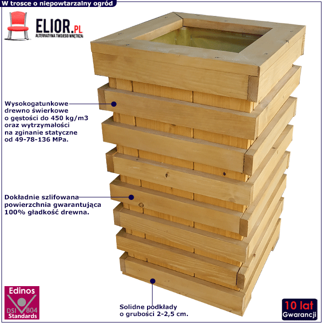 Wybierając odpowiednią donicę ogrodową zwróć uwagę przede wszystkim na jakość wykonania - nie chcesz chyba w następnym sezonie wymieniać jej na nową? My tego unikamy! Dzięki wysokogatunkowym produktom oraz precyzyjnej pracy pod okiem najlepszych specjalistów sprawiliśmy, że donica Estella to istny synonim wysokiej jakości. Drewno świerkowe z którego została wykonana donica bezpośrednio po sośnie zajmuje drugie miejsce pod względem wartości użytkowej drewna. Wyróżnia się niezwykłą trwałością oraz łatwością w obróbce. Jest lekkie i miękkie oraz posiada liczne, regularnie rozmieszczone sęki. Jego barwa jest biała, czasem z lekko żółtym odcieniem. Charakteryzuje się także wysoką gęstością do 450 kg/m3 i wytrzymałością na zginanie statyczne od 49-78-136 MPa.  Te wszystkie cechy sprawiają, że donica Estella absolutnie wyróżnia się na tle produktów konkurencji. Jest niezwykle trwała, stabilna i wyjątkowo designerska! Zadbaj o to, aby otaczające Cię przedmioty charakteryzowały się doskonałą jakością - to podstawowy element każdej dobrze zorganizowanej przestrzeni.