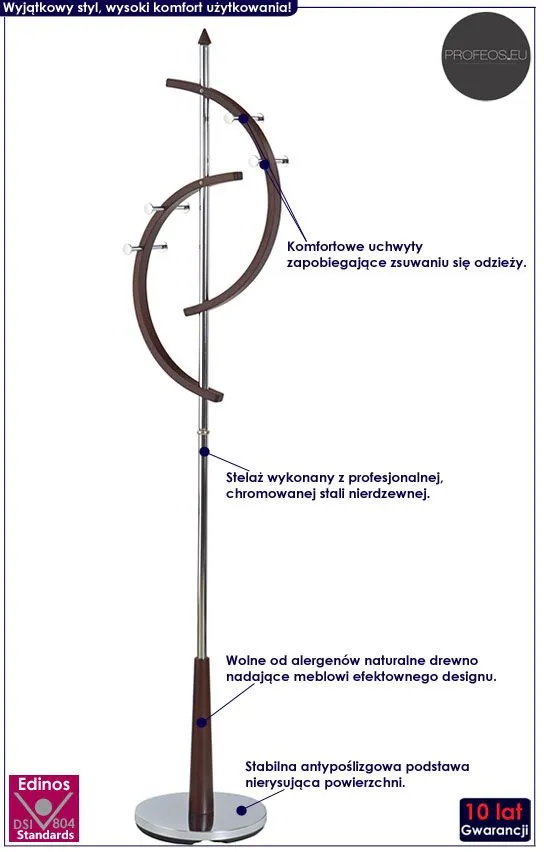 Praktyczny w użytkowaniu wieszak Nepres 5X wyróżnia się nie tylko swoją unikalną formą, ale także zastosowaniem materiałów najlepszej jakości. Profil mebla stworzony jest z najwyższej jakości chromowanej stali o zawartości aż stali nierdzewnej oraz chromu, co gwarantuje mu niezwykły efekt wizualny, posiadając przy tym ponadprzeciętne cechy antykorozyjne oraz lepszą odporność na uszkodzenia mechaniczne . Ozdobne elementy z naturalnego drewna w kolorze czereśnia antyczna dodają stojakowi niebanalnego charakteru. Rozmieszczone na różnych wysokościach, zapobiegające zsuwaniu się ubrań uchwyty pozwalają na samodzielne zawieszenie odzieży także młodszym domownikom. Antypoślizgowa podstawa jest bezpieczna dla wszelkiego rodzaju podłoża i chroni Twoją podłogę przed zarysowaniem. Wnieś do swojego przedpokoju nowoczesny i modny klimat z wieszakiem stojącym Nepres 5X!