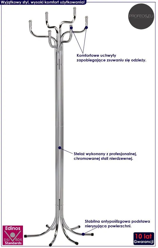Praktyczny w użytkowaniu wieszak Inderio 4X wyróżnia się nie tylko swoją unikalną formą, ale także zastosowaniem materiałów najlepszej jakości. Profil mebla stworzony jest z najwyższej jakości chromowanej stali o zawartości aż stali nierdzewnej oraz chromu, co gwarantuje mu niezwykły efekt wizualny, posiadając przy tym ponadprzeciętne cechy antykorozyjne oraz lepszą odporność na uszkodzenia mechaniczne . Komfortowe uchwyty stojaka zapobiegają zsuwaniu się ubrań. Antypoślizgowe stopki są bezpieczne dla wszelkiego rodzaju podłoża i chronią Twoją podłogę przed zarysowaniem. Wnieś do swojego przedpokoju nowoczesny i modny klimat z wieszakiem stojącym Inderio 4X!