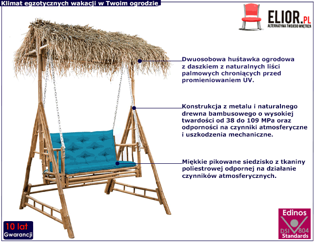 Unikatowa huśtawka Amar marki Elior to świetny pomysł na wyjątkową aranżację ogrodowej strefy wypoczynku.  Do produkcji huśtawki Amar wybraliśmy naturalne  materiały o najwyższych parametrach jakościowych i użytkowych. Konstrukcja powstała z drewna bambusowego  metalu. Bambus jest jednym z najtwardszych drewien na kuli ziemskiej, jego twardość przewyższa rodzime i egzotyczne  gatunki drewna i wynosi od 38 do 109 MPa. Dzięki wysokiej twardości bambus jest wyjątkowo odporny na uszkodzenia mechaniczne, zadrapania i zarysowania. Dzięki dużej stabilności drewna bambusowego meble wykonane z tego surowca są odporne na działanie czynników atmosferycznych, nie kurczą się i nie pęcznieją nawet w miejscach o dużej wilgotności, dlatego doskonale sprawdzają się na trasie i w ogrodzie. Charakteryzują się bardzo wysoką trwałością, wytrzymałością, elastycznością i  lekkością. Ergonomiczne siedzisko zostało zamocowane na metalowych łańcuchach, aby zapewnić maksymalne bezpieczeństwo. Miękkie pikowane poduszki z trwałej tkaniny oferują wysoki poziom komfortu podczas odpoczynku. Każda poduszka zawiera dwa zestawy sznurków, które utrzymują je na miejscu, zapobiegając przesuwaniu. Daszek huśtawki Amar pokryliśmy plecionką z naturalnych liści palmowych. Tak zaprojektowany daszek stanowi bezpieczną osłonę przed szkodliwym promieniowaniem UV, a dzięki zastosowaniu naturalnego surowca nadaje meblowi wybitnie dekoracyjnego efektu w tropikalnym stylu. Tak wykonana huśtawka Amar marki Elior przetrwa wiele letnich sezonów, bez konieczności wymiany i zapewni fenomenalny relaks. Postaw bambusową huśtawkę Amar w ogrodzie i poczuj się w nim jak na rajskiej wyspie już teraz!