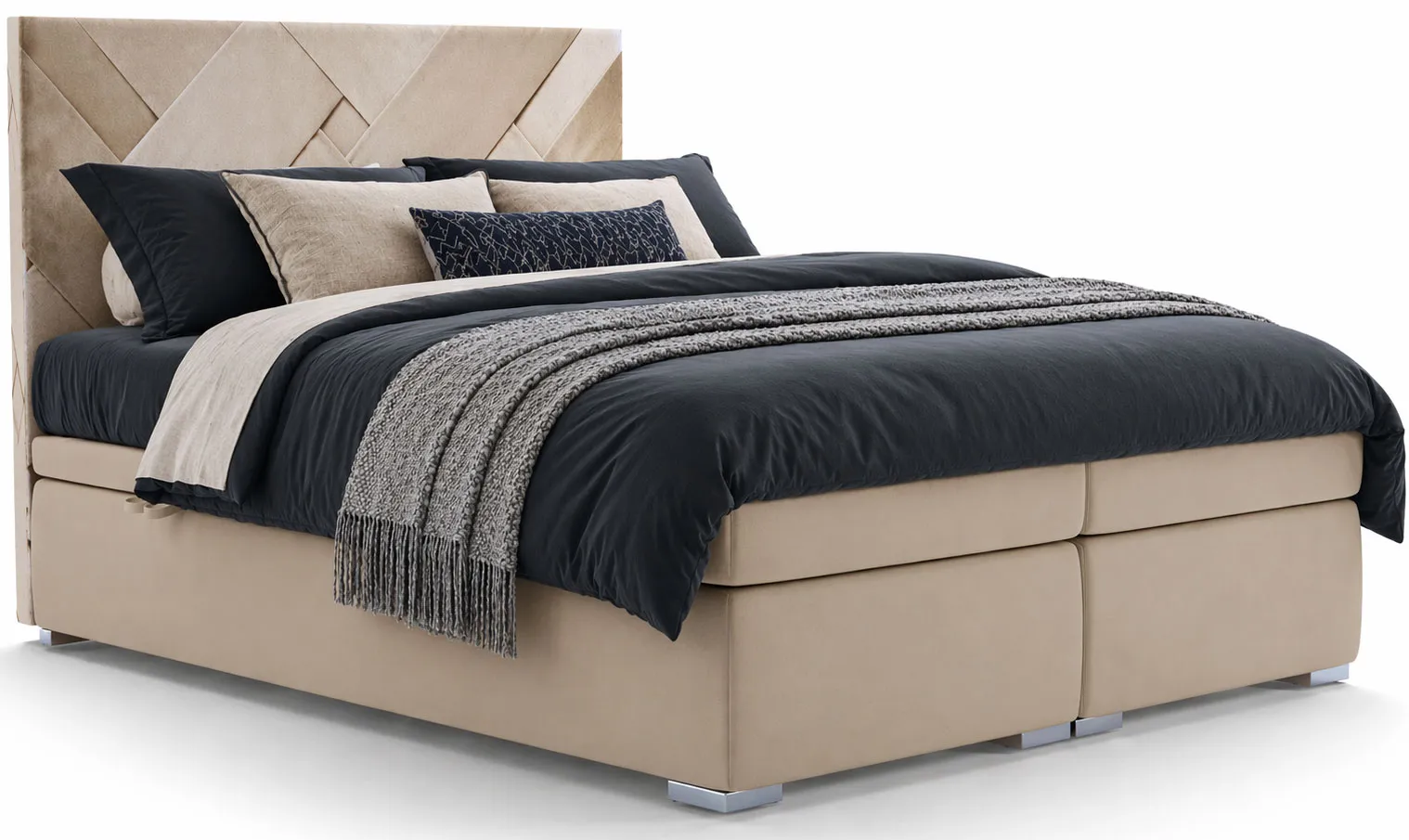Kontynentalne łóżko typu boxspring Murowis marki Edinos Premium to luksusowy model zaprojektowany i stworzony z najwyższej jakości materiałów o doskonałych parametrach technicznych i wytrzymałościowych. Jego podstawę stanowi solidna skrzynia z drewna naturalnego oraz płyty meblowej o klasie higieny A1. Naturalna płyta meblowa to trwały materiał zbudowany z włókien drzewnych i związków organicznych w warunkach wysokiego ciśnienia i temperatury. Włókna o strukturze sinusoidalnej ułożone są różnokierunkowo, co podnosi jej parametry wytrzymałościowe i jakościowe. Dodatkowo płyta została uszlachetniona cienkimi filmami melaminowymi w celu zwiększenia jej trwałości. Łóżko Murowis zostało wyposażone w wygodny podwójny pojemnik na pościel z aurtomatami wspomagającymi otwieranie, dzięki czemu bez problemu zachowasz ład i porządek w sypialni. Na skrzyni opiera się wysoki na 20 cm materac bonellowy z funkcją cyrkulacji powietrza, obłożony pianką o optymalnej dla kręgosłupa gęstości T25. Materac bazowy uzupełnia Topper - materac nawierzchniowy wykonany z termoelastycznej pianki Visco Memory z funkcją pamięci. Pianka Visco Memory pod wpływem ciepła staje się bardzo plastyczna, dzięki czemu idealnie dopasowuje się do ciała, rozluźnia mięśnie oraz przdeciwdziała ich skurczom. Wypoczynek na materacu z pianki Visco ma pozytywny wpływ na poprawę krążenia, co jest szczególnie istotne dla zdrowia osób starszych i z dolegliwościami kręgosłupa. Konstrukcja wkładu zapewnia optymalną dla kręgosłupa twardość powierzchni, odpowiednią przepuszczalność powietrza i wygodę podczas odpoczynku. Miękki wysoki zagłówek, poza funkcją dekoracyjną stanowi ochronę ściany przed zabrudzeniem oraz niezwykle komfortowe oparcie dla pleców. Masz dość nieprzespanych nocy? Nawet poranna kawa ratuje sytuacji, kiedy budzisz się z bólem pleców? Potrzebujesz czegoś specjalnego! Kontynentalne łóżko Lefka marki Edinos Premium zapewni Ci idealny komfort podczas snu i wspaniale urządzi Twoją sypialnię.
