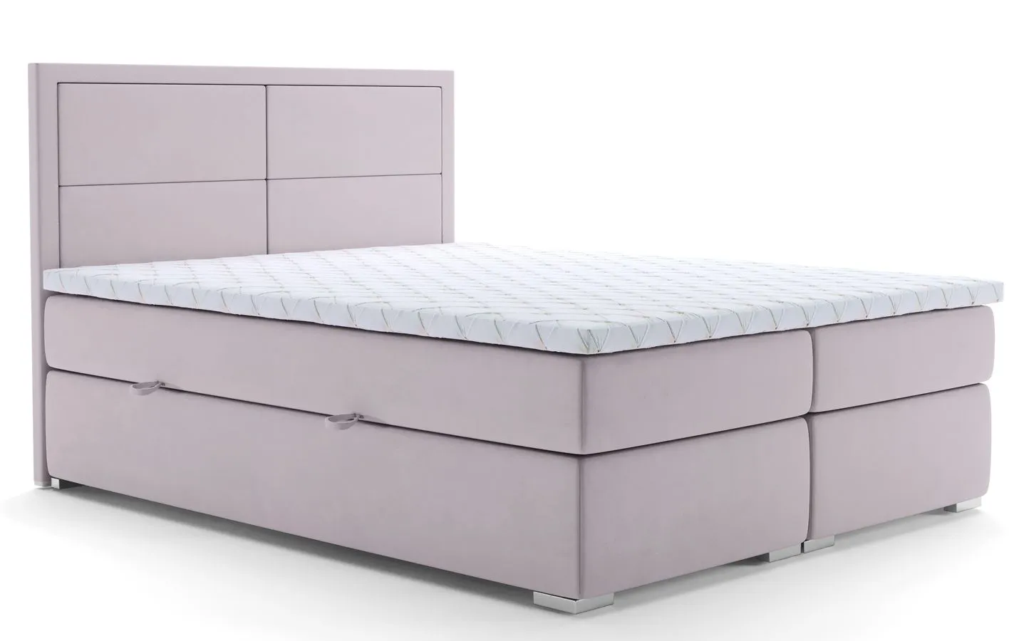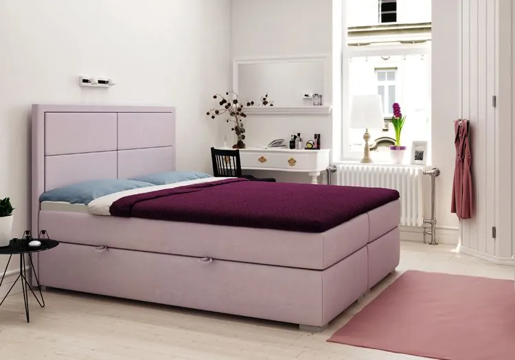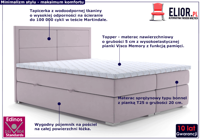 - Łóżko wyposażone jest w pojemnik na pościel, wysokiej jakości materac bazowy typu bonell z pianką T 25 o grubości 20 cm i Topper z pianki Visco Memory o grubości 5 cm.