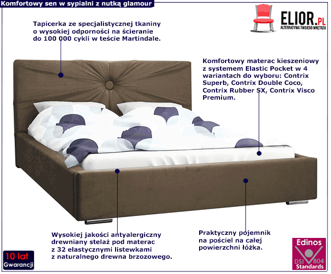 Tapicerowane łóżko Loscio 2X marki Elior to fantastyczny mebel zaprojektowany z myślą o osobach, które od mebli sypialnianych oczekują niezrównanego komfortu, najwyższej jakości oraz wybitnego designu. Loscio 2X stanowi genialny przykład miksu funkcji użytkowych z walorami dekoracyjnymi. Podstawę łóżka tworzy skrzynia o grubości 1,6 mm, wykonana z drewna naturalnego i płyty meblowej zbudowanej z włókien drzewnych i związków organicznych oraz uszlachetnionej cienkimi filmami melaminowymi w celu zwiększenia jej trwałości. Na skrzyni obłożonej profesjonalną pianką o grubości T25 i tapicerowanej szlachetną tkaniną welwetową lub ekoskórą opiera się doskonały jakościowo drewniany stelaż z 32 sprężynujących listewek z naturalnego drewna brzozowego. Tak wykonany stelaż ułatwia cyrkulację powietrza pod materacem, co pozytywnie wpływa na jakość snu oraz wydłuża żywotność materaca. Łóżko Loscio 2X zostało wyposażone w pojemny schowek na pościel, bardzo łatwo otwierany przy pomocy specjalistycznych podnośników sprężynowych. Fenomenalne łóżko Loscio 2X to 100% pewność najwyższej jakości, wieloletniej trwałości oraz afirmacja absolutnego komfortu i zdrowego snu.