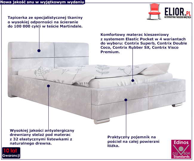 Dobrze skonstruowane łóżko wyróżnia się ponadprzeciętną urodą, trwałością i nadzwyczajną wygodą. Łóżko Erli 2X marki Edinos Premium to wyjątkowy model, precyzyjnie zaprojektowany i starannie wykonany z profesjonalnych surowców o najwyższym stopniu trwałości i bezpieczeństwa dla zdrowia. Podstawę łóżka Erli 2X stanowi skrzynia o grubości 1,6 mm wykonana z drewna naturalnego i płyty meblowej zbudowanej z włókien drzewnych i związków organicznych oraz uszlachetnionej cienkimi filmami melaminowymi w celu zwiększenia jej trwałości. Na skrzyni obłożonej profesjonalną pianką o grubości T25 i tapicerowanej szlachetną tkaniną lub ekoskórą opiera się doskonały jakościowo drewniany stelaż z 32 elastycznych listewek wykonanych z naturalnego drewna. Tak zaprojektowany stelaż ułatwia cyrkulację powietrza pod materacem, dzięki czemu doskonale wpływa na jakość i komfort snu oraz wydłuża żywotność materaca. Łóżko Erli 2X zostało dodatkowo wyposażone w pojemny schowek na pościel, niezwykle łatwo otwierany dzięki zamontowanym podnośnikom sprężynowym. Już brzmi nieźle, prawda? A dalej jest jeszcze lepiej!