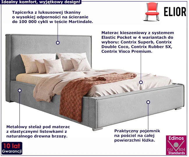 Tapicerowane łóżko Mensis 3X 160x200 to wyjątkowy mebel sypialniany stworzony z myślą o osobach oczekujących maksymalnego komfortu, wieloletniej trwałości oraz designu na najwyższym światowym poziomie. Marka Edinos Premium, która od lat cieszy się renomą w świecie designu, słynie z tworzenia luksusowych mebli o najlepszych parametrach jakościowych i stylistycznych. Każdy projekt marki Edinos Premium to wyjątkowe dzieło sztuki meblarskiej, zaś łóżko Mensis 3X dzięki zastosowaniu nowoczesnych komponentów o najwyższych parametrach technicznych i jakościowych, jest nie tylko wyjątkowo piękne i komfortowe, ale także trwałe i bezpieczne w użytkowaniu. Podstawę łóżka Mensis 3X stanowi skrzynia o grubości 1,6 mm wykonana z drewna naturalnego i płyty meblowej zbudowanej z włókien drzewnych i związków organicznych oraz uszlachetnionej cienkimi filmami melaminowymi w celu zwiększenia jej trwałości. Na skrzyni obłożonej profesjonalną pianką o grubości T25 i tapicerowanej szlachetną tkaniną opiera się doskonały jakościowo metalowy stelaż z 36 sprężynujących listewek z naturalnego drewna brzozowego. Tak zaprojektowany stelaż ułatwia cyrkulację powietrza pod materacem, dzięki czemu rewelacyjnie wpływa na jakość i komfort snu oraz wydłuża żywotność materaca. Dla maksymalnego komfortu i wygody, łóżko Mensis 3X zostało wyposażone w pojemny schowek na pościel, niezwykle łatwo otwierany za pomocą profesjonalnych podnośników gazowych, dzięki czemu łatwo zachowasz ład i porządek w sypialni.