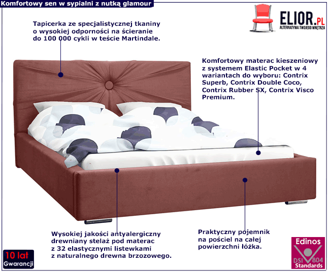 Zdrowy sen i wypoczynek zapewnia właściwie dobrany, specjalistyczny materac. W odpowiedzi na potrzeby swoich klientów, marka Elior zaprojektowała aż cztery profesjonalne materace, dopasowane do tapicerowanego łóżka Loscio 2X. Wszystkie 4 modele zostały wyposażone w system kieszeni Elastic Pocket ze strefami o zróżnicowanej twardości zapewniającymi ergonomiczną pozycję ciała. Każda sprężyna jest w osobnej otulinie z wyjątkowo elastycznego materiału, który zapobiega przecieraniu się i pękaniu kieszonek, eliminując przy tym efekt wyginania się kieszeni i dodatkowo zwiększając wytrzymałość. Sprężyny zostały wykonane w najnowocześniejszej technologii CONTROLHARD, wykorzystującej podwójne hartowanie drutu węglowego, które zapewnia ponad 50% wydłużoną żywotność. Dodatkowo każdy materac został wyposażony w pikowany pokrowiec antyalergiczny o wydłużonym cyklu ścieralności z wszytym zamkiem, który dzięki możliwości zdjęcia i wyprania pozwala zachować świeżość i najwyższy poziom higieny.