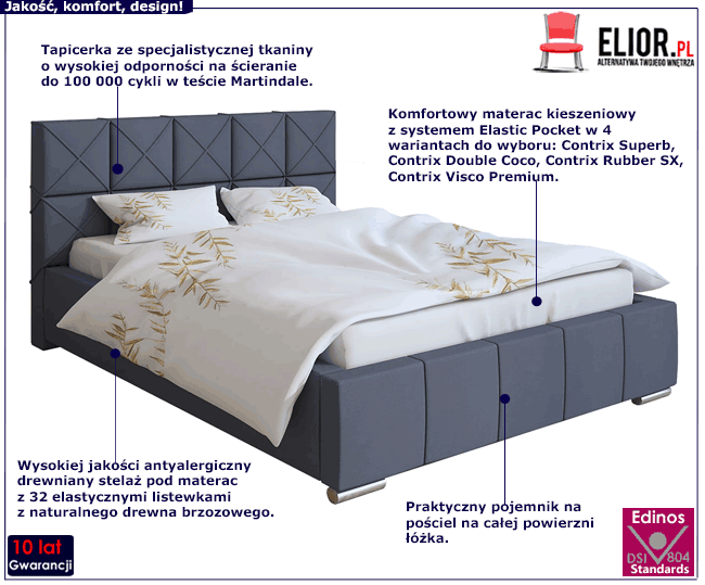 - Ergonomiczna konstrukcja - brak wystającej drewnianej, czy metalowej ramy powoduje, że nie ma ostrych kantów, o które można się uderzyć, jest miękko i bezpiecznie. Tak skonstruowane łóżko nie skrzypi, dzięki czemu nie będziesz się wybudzać przy każdej zmianie pozycji ciała.