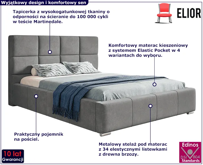 - Ergonomiczna konstrukcja - brak wystającej drewnianej, czy metalowej ramy powoduje, że nie ma ostrych kantów, o które można się uderzyć, jest miękko i bezpiecznie. Tak skonstruowane łóżko nie skrzypi, dzięki czemu nie będziesz się wybudzać przy każdej zmianie pozycji ciała.