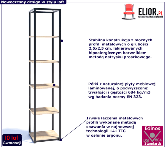 Regał Lenisa 2X to efekt pracy teamu utalentowanych designerów marki Elior. Lenisa 2X został stworzony z myślą o osobach, dla których parametry jakościowe mebli są równie ważne, co ich walory dekoracyjne. Ten niezwykle funkcjonalny mebel cechuje się nie tylko oryginalną minimalistyczną formą, ale także zastosowaniem nowoczesnych materiałów o najwyższych europejskich normach jakości i bezpieczeństwa w użytkowaniu. Zgeometryzowana forma półki opiera się solidnej i trwałej konstrukcji z metalowych profili o wymiarach 2,5x2,5 cm. Profile metalowe zostały dla podniesienia trwałości oraz efektu dekoracyjnego zabezpieczone metodą lakierowania proszkowego profesjonalnym barwnikiem odpornym na zarysowania i zadrapania. Najwyższa jakość techniki metody natrysku proszkowego pozwoliła zaoferować firmie Elior aż 10 lat gwar. na swoje produkty. Technika malowania proszkowego charakteryzuje się dużą trwałością, odpornością na korozję, chemikalia, wysoką temperaturę oraz uszkodzenia mechaniczne, dzięki czemu znacznie podnosi walory użytkowe i estetyczne mebla. Trwałe łączenia metalowych profili zostały wykonane metodą spawania w najnowszej technologii 141 TIG w osłonie argonu, co zapewnia stabilność mebla i bezpieczeństwo użytkowania. Mocne i wytrzymałe półki wyprodukowano z profesjonalnej płyty meblowej laminowanej o podwyższonej trwałości i gęstości. Naturalna płyta meblowa o klasie higieny E1 zbudowana została z włókien drzewnych i związków organicznych w warunkach wysokiego ciśnienia i temperatury. Dodatkowo uszlachetniono ją cienkimi filmami melaminowymi, by zwiększyć jej trwałość. Włókna melaminowe ułożone są różnokierunkowo, o strukturze sinusoidalnej, co zapewnia nadanie jej cech jakościowych oraz wytrzymałościowych. Doskonała jakość materiałów, użytych do projektu regały Lenisa 2X, odważny bezkompromisowy design oraz precyzyjne wykonanie tworzą wyjątkowy mebel, który będzie idealną odpowiedzią na potrzeby najbardziej wymagających użytkowników. Poza unikatowym stylem i rewelacyjną jakością i trwałością, niewątpliwą zaletą Lenisa 2X jest nieprzeciętna łatwość w utrzymaniu. Dzięki ażurowej konstrukcji, otwartym półkom, możliwość gromadzenia kurzu jest ograniczona do minimum, co jest niezwykle istotne dla osób uczulonych i alergików. Mebel wystarczy przetrzeć wilgotną ściereczką i wytrzeć do sucha, by cieszyć się jego funkcjonalnością i urodą bez konieczności kłopotliwej konserwacji lub ponownego malowania. Szukasz nowoczesnych mebli do salonu lub biura, które będą praktyczne, funkcjonalne i idealnie zdefiniują Twój niepowtarzalny styl? Wybierz regał Lenisa 2X marki Elior i wprowadź nową jakość do Twojego wnętrza.