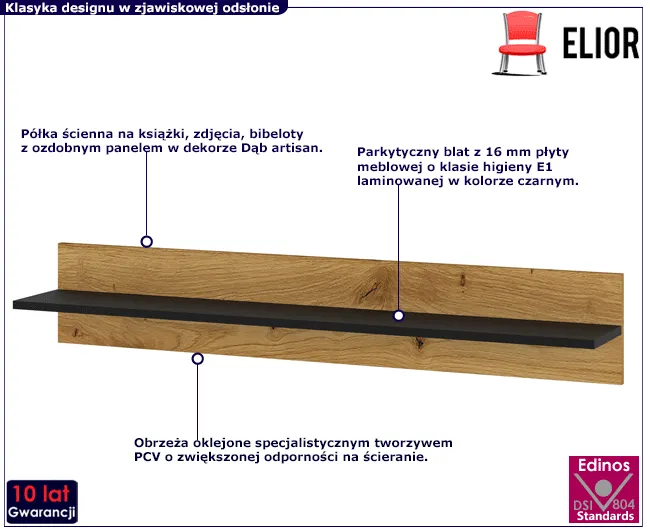 Półkę ścienna Lenifo 10X zrobiliśmy z najwyższej jakości 16 mm laminowanej płyty meblowej o klasie higieny E1. Płyta meblowa została zbudowana z włókien drzewnych i związków organicznych w warunkach wysokiego ciśnienia i temperatury. Włókna ułożone są różnokierunkowo, co podnosi parametry wytrzymałościowe i jakościowe surowca. Dodatkowo, w celu zwiększenia trwałości, płytę uszlachetniliśmy cienkimi filmami melaminowymi. Obrzeża półki zostały precyzyjnie oklejone specjalistycznym tworzywem PCV o zwiększonej odporności na ścieranie i wilgoć. Projekt mebla został przemyślany w najdrobniejszych szczegółach. Szeroki na 115 cm blat zapewnia wystarczająco dużo miejsca na kolekcję zdjęć, płyt, książek lub bibelotów. Poprzeczny panel w unikatowym dekorze Dąb artisan wspaniale ożywia minimalistyczny design połki, a przy tym skutecznie kryje elementy montażowe oraz chroni ścianę przed zabrudzeniami. Tak zaprojektowana półka ścienna Lenifo 10X marki Elior to doskonały sposób na niebanalną aranżację salonu. Może właśnie Twojego salonu?