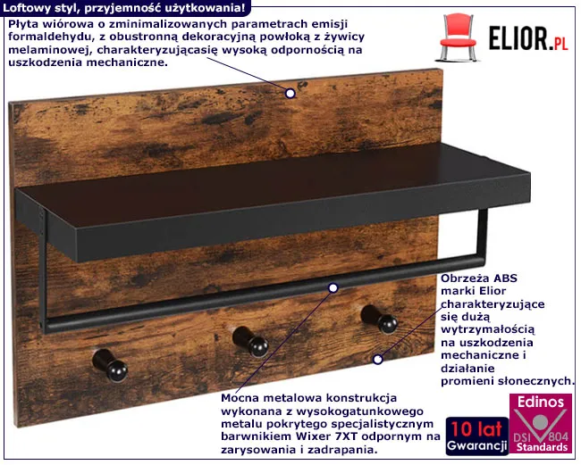 Wieszak Zevi wykonano z wysokogatunkowego metalu pomalowanego proszkowo specjalistycznym odpornym na zarysowania i zadrapania. Gwarantuje to stabilność i trwałość mebla. Półka zniesie obciążenie nawet ciężkimi zimowymi kurtkami. Do wykonania tego praktycznego mebla wykorzystano także najwyższej jakości płytę wiórową marki Elior, która charakteryzuje się niezwykłą odpornością na uszkodzenia mechaniczne. Jej ciepły kolor rustykalnego brązu nadaje półce modnego industrialnego kontrastu poszukiwanego w nowoczesnych wnętrzach. Wybierz meble, które będą towarzyszyć Ci przez długie lata. Postaw na jakość. Postaw na markę Elior. Dla nas Twoje zadowolenie to najlepsza wizytówka.