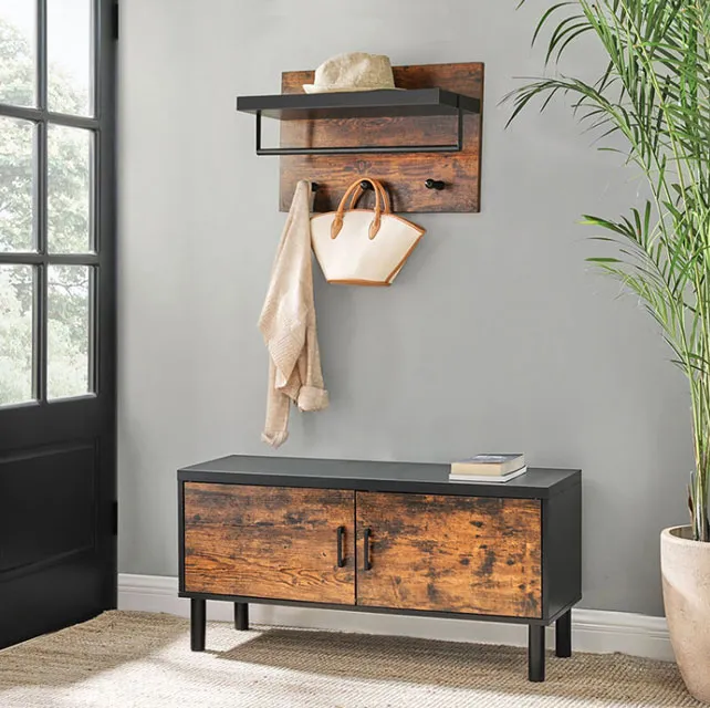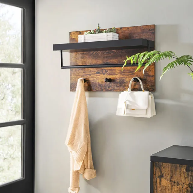 Spójrz na stylową, przykładową korytarza z wykorzystaniem industrialnej półki z wieszakiem Zevi marki Elior poniżej.