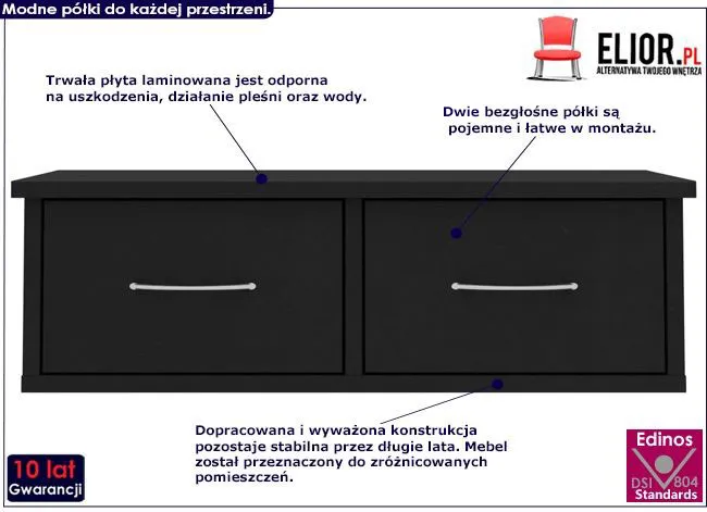 - Wymiary półki: szerokość – 60 cm, głębokość – 26 cm, wysokość – 18,5 cm - Materiał: płyta ze sprasowanych włókien drzewnych. - Kolor: czarny. Kliknij w link i sprawdź także inne półki ścienne w sklepie Edinos.pl. Stwórz swój praktyczny zestaw mebli. - Produkt posiada certyfikat jakości "Edinos Standards DSI 804", który potwierdza najwyższą jakość wykonania mebla oraz pełny stopień zgodności poszczególnych jednostek wytworzonego wyrobu z przyjętym wzorcem. - Bardzo łatwy montaż (w zestawie znajduje się czytelna i dokładna instrukcja montażu mebla). - Gwarancja 10 lat (inni producenci oferują maksymalnie 24 miesiące gwarancji. Tylko u nas otrzymujesz pełną jakość potwierdzoną aż 10-letnią gwarancją)!