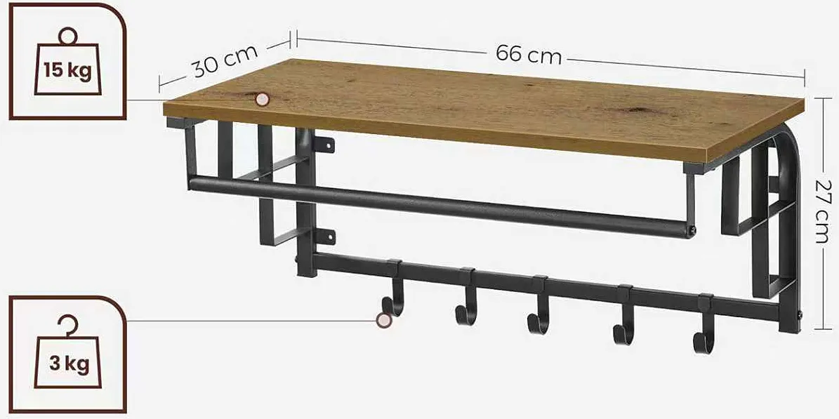 Estetyka minimalistyczna i jednocześnie praktyczna bo półka nie przytłacza ściany, dąb jest ładny, haczyki mocne. Dobry wybór dla tych, którzy chcą uporządkować garderobę.