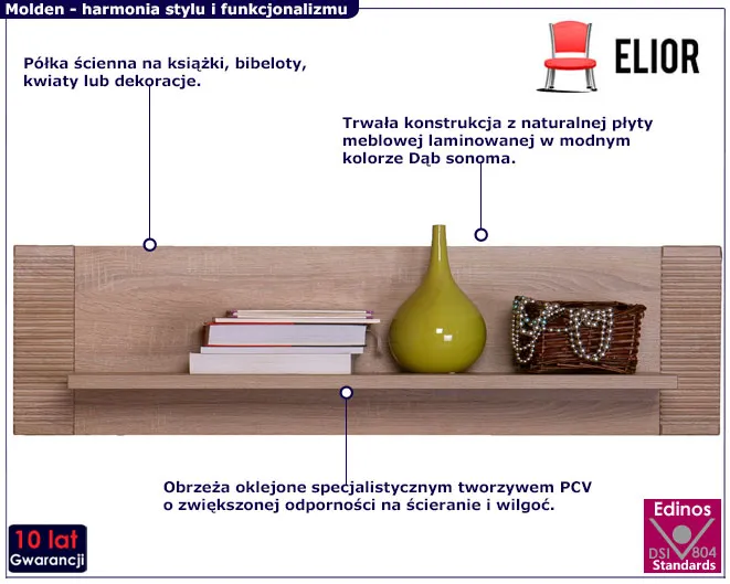 Kolekcja Molden od Edinos Premium to zaproszenie do stworzenia wnętrza, w którym dominuje spokój, harmonia i bliskość natury. Niezależnie od tego, czy aranżujesz salon, sypialnię, czy gabinet - Molden wprowadzi do Twojego domu ciepło natury i nowoczesny design. Nie czekaj, zamów jeszcze dziś półkę ścienną Donet 20X, a dostaniesz ją w atrakcyjnej cenie 358 zł. Postaw na minimalizm, który inspiruje, funkcjonalność, która ułatwia życie i styl, który pozostaje ponadczasowy. Postaw na półkę Donet 20X już teraz!