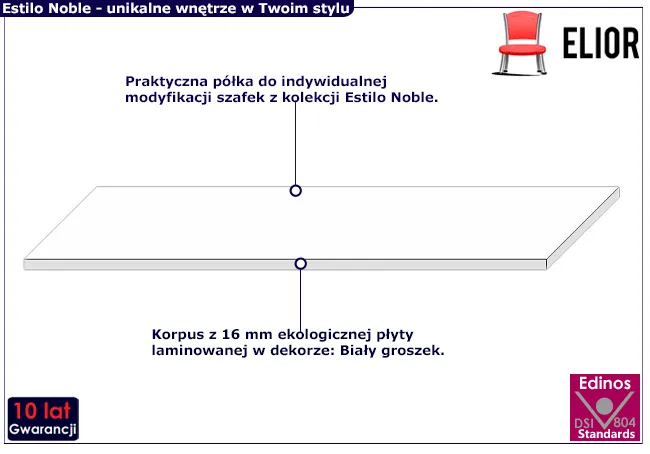 • Produkt posiada certyfikat jakości "Edinos Standards DSI 804", który potwierdza najwyższą jakość wykonania mebla oraz pełny stopień zgodności poszczególnych jednostek wytworzonego wyrobu z przyjętym wzorcem.