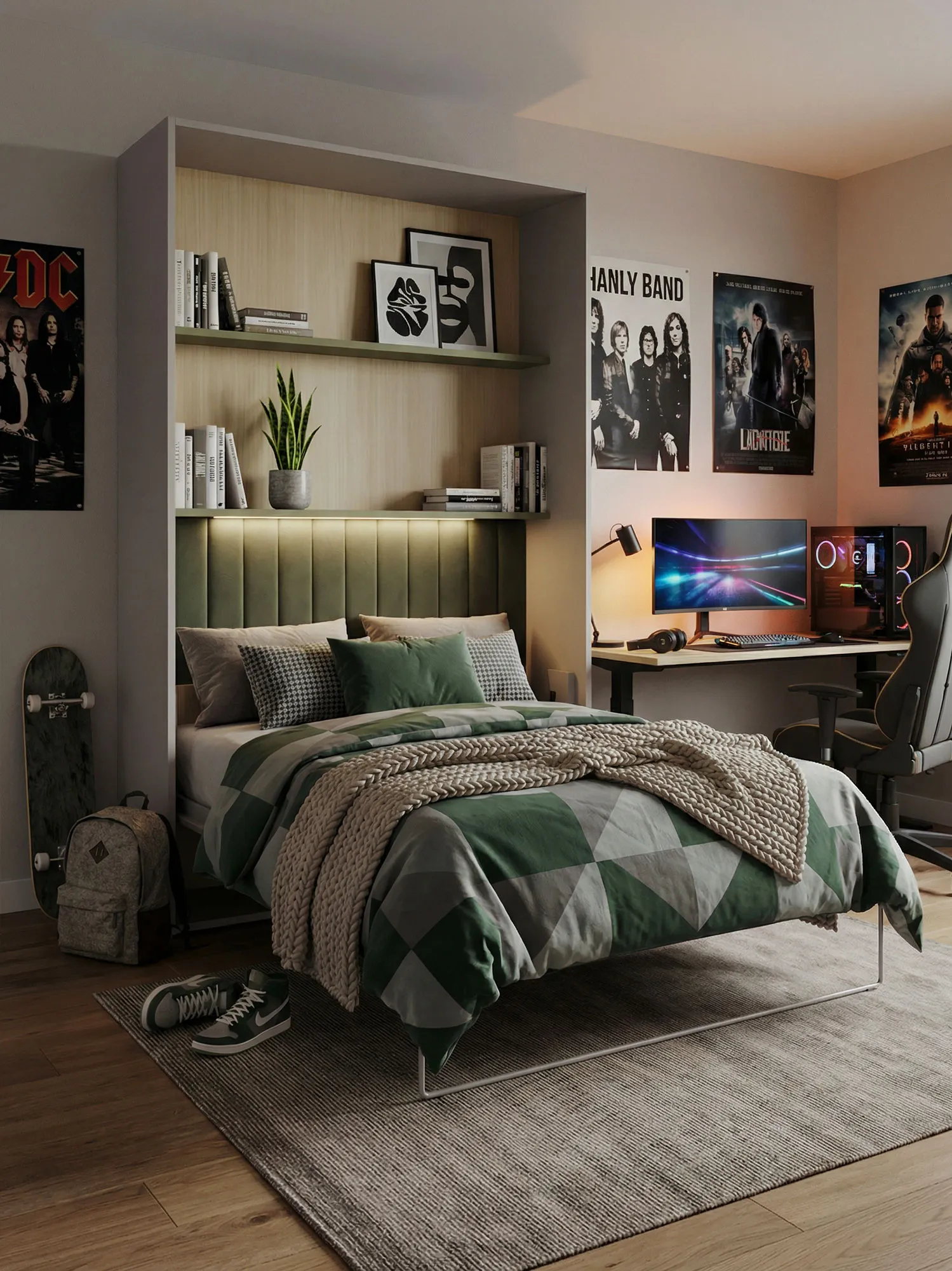 Aranżacja pokoju nastolatka z wykorzystaniem półkotapczanu Zimi 5X kaszmir + zielony