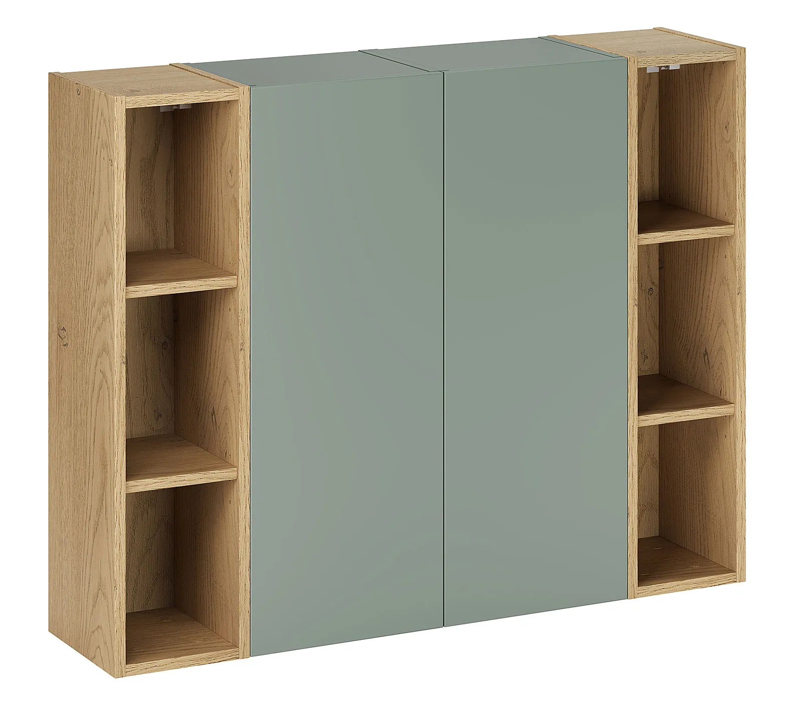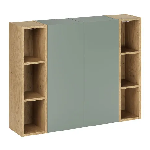 Szafka wisząca Verdessa 6X to funkcjonalny element zabudowy łazienkowej, który łączy zamkniętą przestrzeń do przechowywania z wygodnymi, otwartymi półkami po bokach. Centralna część z gładkimi frontami pozwala estetycznie ukryć akcesoria i kosmetyki, natomiast boczne wnęki w dekorze drewna zapewniają szybki dostęp do najczęściej używanych przedmiotów. Połączenie matowego, zielonego frontu z naturalnym odcieniem drewna nadaje meblowi lekkości i wprowadza do łazienki przytulny, harmonijny charakter.
