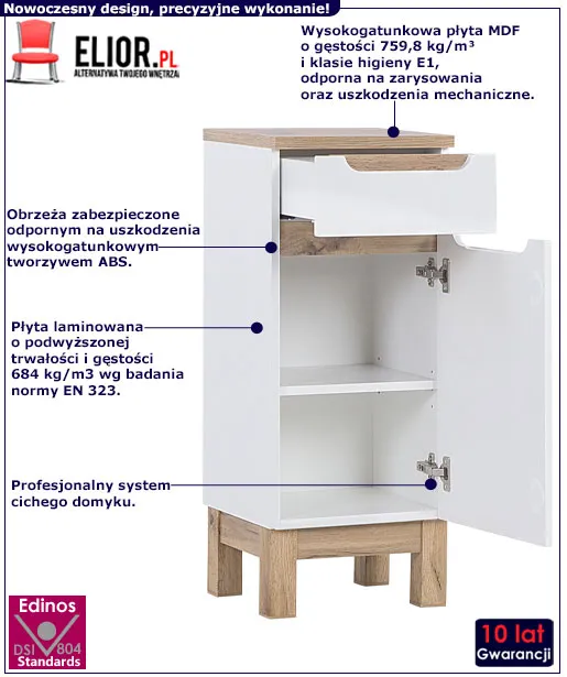 • Kolor: Biały połysk, dąb wotan. Sprawdź także inne regały i szafki łazienkowe w sklepie Edinos.pl. Stwórz swój praktyczny zestaw mebli.