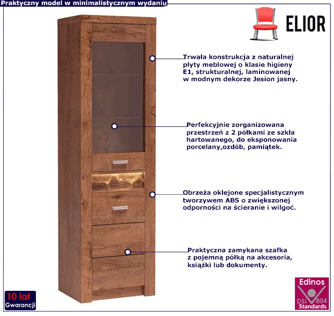 Stylowy regał z witryną Filin 5X to kolejna propozycja marki Edinos Premium, wchodząca w skład naszej kolekcji modernistycznych mebli Dagna, która powstała z potrzeby połączenia walorów użytkowych z niebanalnym designem. Witryna Filin 5X to wyjątkowy mebel dedykowany użytkownikom niewielkich mieszkań i kawalerek, w których funkcjonalnie zaplanowana przestrzeń jest szczególnie ważna. Regał Filin 5X wyróżnia się prostą, geometryczną bryłą oraz precyzyjnie zaplanowanym wnętrzem do przechowywania. Nowoczesny, minimalistyczny design w modnym wybarwieniu Jesion jasny, z pięknie ryflowaną ozdobną deską fantastycznie uzupełni aranżację dowolnego pomieszczenia, zapewniając wystarczająco dużo miejsca do przechowywania, a przy tym nie przytłaczając wnętrza. Kompaktowe wymiary, szlachetna kolorystyka oraz uniwersalny design witryny Filin 5X to doskonały przepis na niesztampową aranżację wnętrza. A to przecież wcale nie koniec zalet tej fenomenalnej witryny. Sprawdź czym jeszcze wyróżnia się witryna Filin 5X marki Edinos Premium!