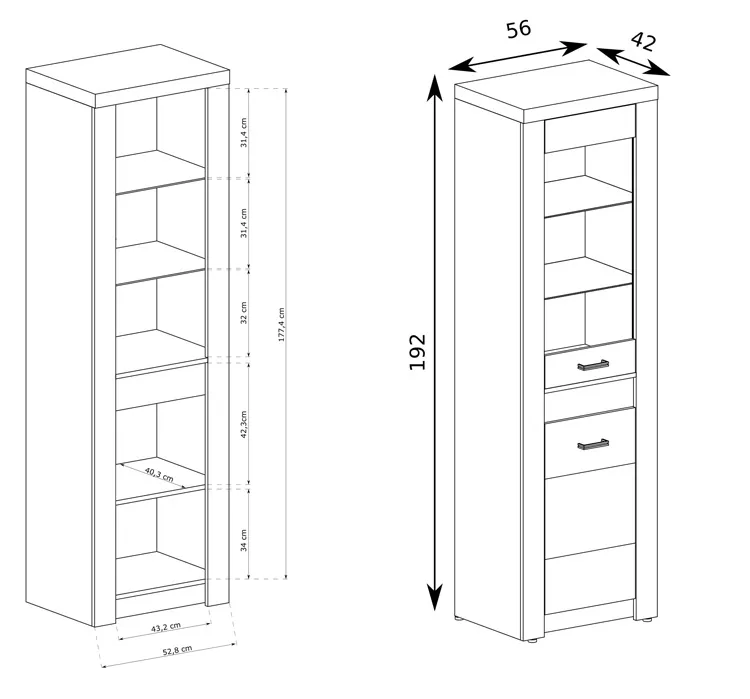 - Wymiary całkowite: wysokość: 192 cm, szerokość: 56 cm, głębokość: 42 cm.