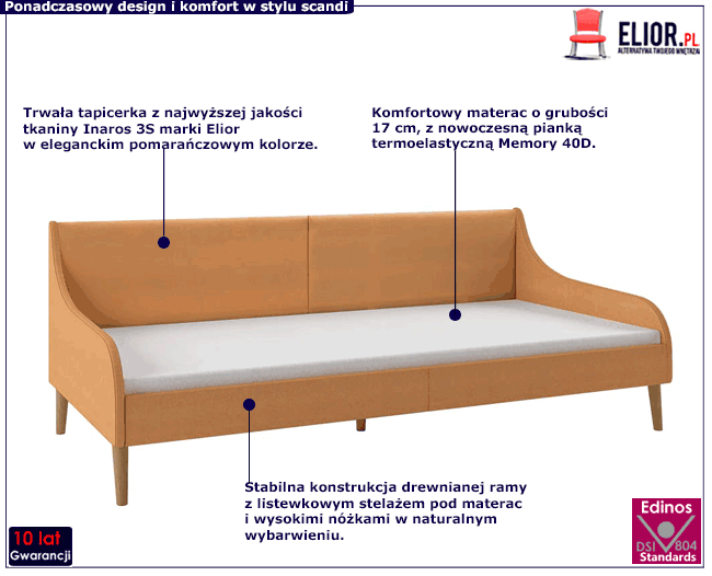 Kanapa Wollio marki Edinos Premium to wyjątkowy mebel wypoczynkowy wykonany z zastosowaniem nowoczesnych i trwałych materiałów. Podstawę sofy stanowi stabilna drewniana rama z szerokim oparciem i wysokimi podłokietnikami, osadzona na smukłych nogach. Dzięki zastosowaniu wysokich nóżek pod kanapą nie będzie gromadził się kurz, co jest szczególnie ważne dla alergików W ramie znajduje się stelaż z mocnych listewek, na którym opiera się komfortowy materac o grubości 17 cm. Materac składa się z 2 cm pianki termoelastycznej Memory z funkcją pamięci, 2 warstw pianki tapicerskiej oraz obustronne poszycie z mocnej tkaniny. Pianka Memory pod wpływem ciepła staje się bardzo plastyczna i idealnie dopasowuje się do ciała, rozluźnia mięśnie i zapobiega ich skurczom oraz pozytywnie wpływa na poprawę krążenia krwi, dzięki czemu sen na takiej powierzchni ma dobroczynny wpływ na zdrowie osób starszych i z dolegliwościami kręgosłupa. Konstrukcja wkładu zapewnia optymalną dla kręgosłupa twardość powierzchni, odpowiednią przepuszczalność powietrza i wygodę podczas odpoczynku. Elegancka tapicerka powstała z wysokiej jakości tkaniny obiciowej z kolekcji Inaros 3S, o mocnym splocie przypominającym nieco naturalne płótno. Tkanina ta jest antyalergiczna, wolna od substancji szkodliwych w stężeniach mających negatywny wpływ na stan zdrowia człowieka m.in. pestycydów, chlorofenoli, formaldehydu, barwników alergizujących oraz zabronionych barwników azowych. Tkanina Inaros 3S jest bardzo praktyczna, a dzięki możliwości czyszczenia na mokro jest bardzo łatwa w utrzymaniu i pielęgnacji. Ponadto posiada ponadprzeciętne cechy wytrzymałościowe, dzięki czemu możesz zapomnieć o kłopotliwej wymianie tapicerki i cieszyć się wybitną jakością i urodą kanapy Wollio przez długie lata. Zapomnij o niewygodnych dmuchanych materacach i składanych łóżkach dla gości. Postaw na jakość i ponadczasowy styl! Zamów sofę Wollio i zaproś gości na weekend już teraz!