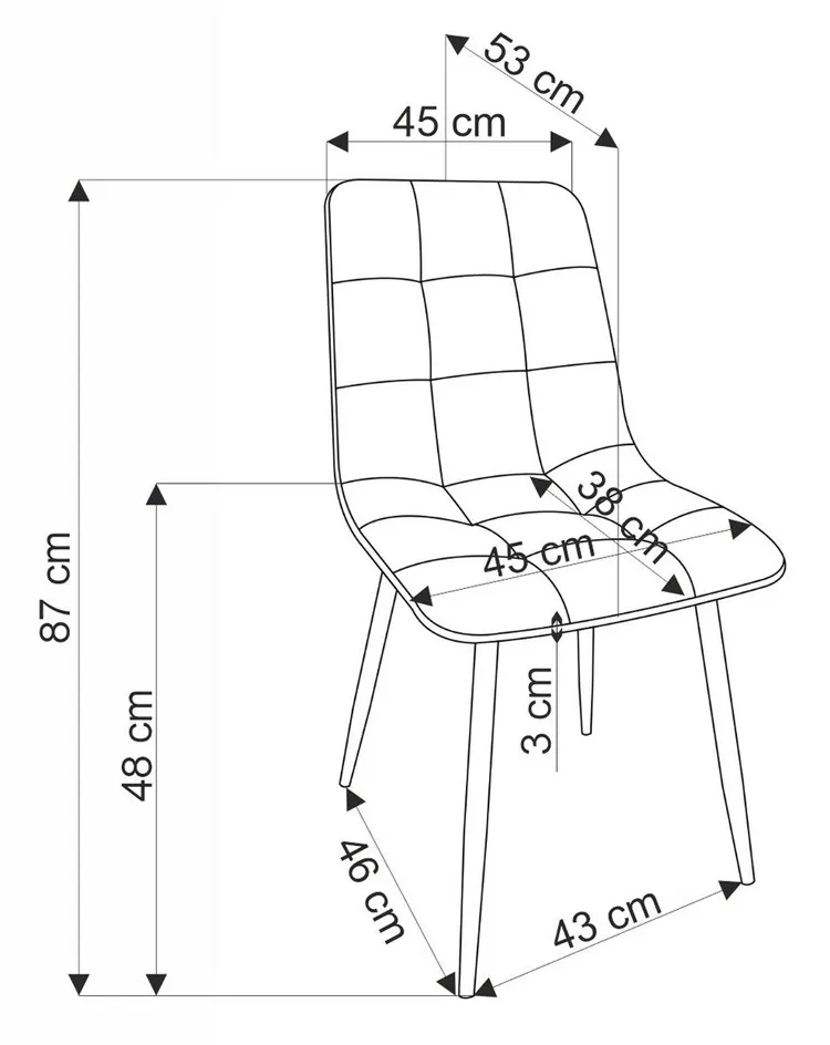 • Wymiary: szerokość: 45 cm, głębokość: 53 cm, wysokość: 87 cm, wysokość siedziska: 48 cm.