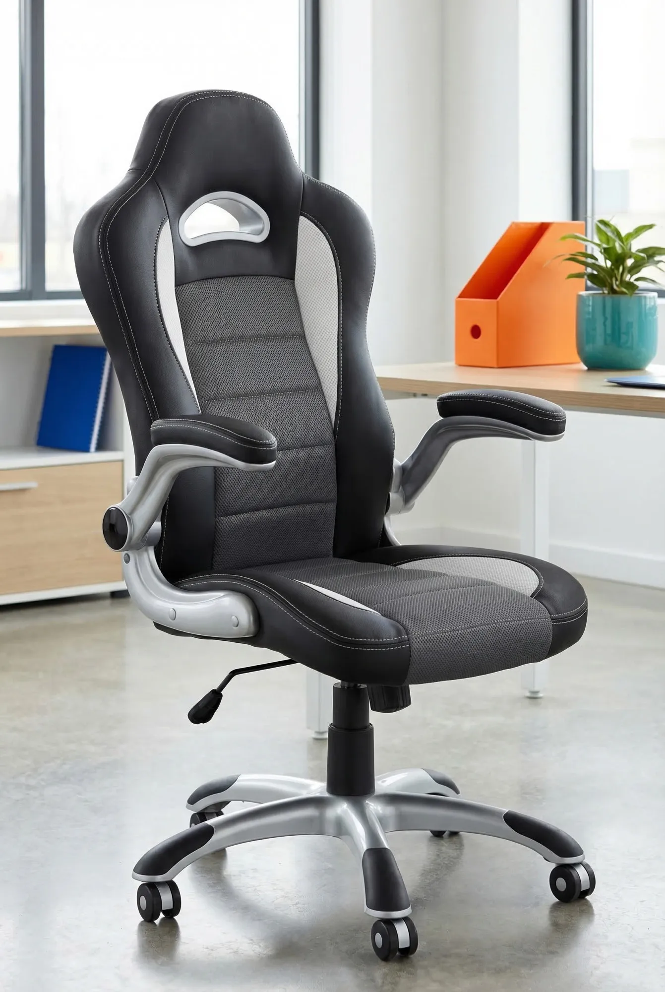 Fotel jest wygodny i stabilny - siedzisko dobrze podpiera plecy, a obrotowa podstawa działa płynnie, co ułatwia codzienną pracę przy biurku. Popielaty kolor wygląda nowocześnie i pasuje do różnych aranżacji wnętrz.