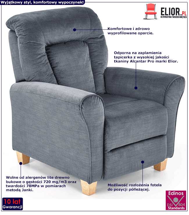 Po intensywnym dniu pełnym obowiązków, hałasu i ciągłego biegu, warto zatrzymać się choć na chwilę i zatroszczyć o własny komfort. Rozkładany fotel wypoczynkowy Calan marki Edinos Premium to propozycja dla tych, którzy cenią wygodę, styl i jakość w jednym, a szczególnie dla seniorów poszukujących funkcjonalnych rozwiązań wspierających codzienny relaks. Wystarczy zająć miejsce, rozłożyć oparcie, zamknąć oczy i pozwolić, by miękkie wypełnienie oraz relaksująca niebieska tonacja mebla otuliły Cię przyjemnym spokojem. To nie tylko fotel – to Twoja nowa, ulubiona strefa wyciszenia i regeneracji, która zadba o ciało i umysł. W Calanie naprawdę odpoczniesz – i fizycznie, i psychicznie.