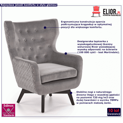 Ekskluzywny fotel Xoda to niezwykłe połączenie wyrafinowanego stylu glamour i czysto użytkowych funkcji najwygodniejszych mebli w historii designu - foteli uszaków. Fotele uszaki są wprost stworzone do spędzania w nich długich, niespiesznych popołudni, ożywczych regeneracyjnych drzemek, czytania pasjonujących lektur - słowem są stworzone, by delektować się życiem. Doskonale wyprofilowane szerokie oparcie, w którym można się wygodnie zagłębić i oprzeć głowę o jego wysunięty bok oraz miękkie, głębokie siedzisko to obietnica wyśmienitego relaksu i wypoczynku. Fotel Xoda marki Edinos Premium to wyjątkowy przedstawiciel foteli uszaków. Luksusowa tapicerka mebla została wykonana z francuskiej ekskluzywnej tkaniny River w pięknym popielatym kolorze. Stylowe pikowania na oparciu i szykowne przeszycia na bokach dodają mu klasy i wyjątkowego uroku. Zestawienie konstrukcji fotela z miękka i aksamitną fakturą tapicerki oraz stabilnymi nóżkami z litego drewna w klasycznej czerni, tworzą mebel o ponadczasowym wdzięku i wyjątkowo dekoracyjnym efekcie. Tak zaprojektowany fotel doskonale sprawdzi się w wielu aranżacjach, od wnętrz urządzonych w stylu skandynawskim i klasycznym, po aranżacje z nutka glamour i boho. Fantastycznie podkreśli wytworny styl salonu lub pokoju dziennego. Świetnie uzupełni romantyczny charakter sypialni lub klasyczną aranżację gabinetu. Fotel Xoda doskonale urządzi hotelowe lobby, luksusowe apartamenty dla gości, czy wnętrza nastrojowych kawiarni. Zadbaj o prawdziwy relaks i domową atmosferę gdziekolwiek jesteś. Zanurz się w przytulną miękkość fotela Xoda i smakuj chwilę.