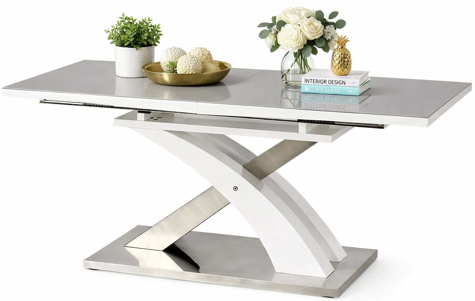 Elegancja, wdzięk i jakże modny ostatnio minimalizm to cechy najnowszego stołu Nomer i pokusa nie tylko dla Twojego oka. Mebel wyróżnia się nie tylko swoją unikalną formą ale także zastosowaniem materiałów najlepszej jakości. To dlatego cieszy się on powodzeniem wśród osób lubiących ciekawe rozwiązania. Użyta do produkcji stołu lakierowana płyta laminowana MDF w kolorze dąb sonoma, została uszlachetniona cienkimi filmami melaminowymi. Posiada także specjalne włókna ułożone różnokierunkowo o strukturze sinusoidalnej, co zapewnia nadanie jej cech jakościowych oraz wytrzymałościowych. Designerski blat wykonany został ze specjalnej płyty komórkowej, której główną zaletą jest redukcja ciężaru bez utraty stabilności oraz innych funkcji konstrukcyjnych. Za pomocą wygodnej prowadnicy wraz z rolką, możesz szybko rozłożyć blat stołu o długości 160 cm do aż 220 cm. Już nie musisz martwić się o miejsca przy stole na kolejnej domowej imprezie. Nowy stół Nomer jest z pewnością praktyczny i wyjątkowo elegancki.