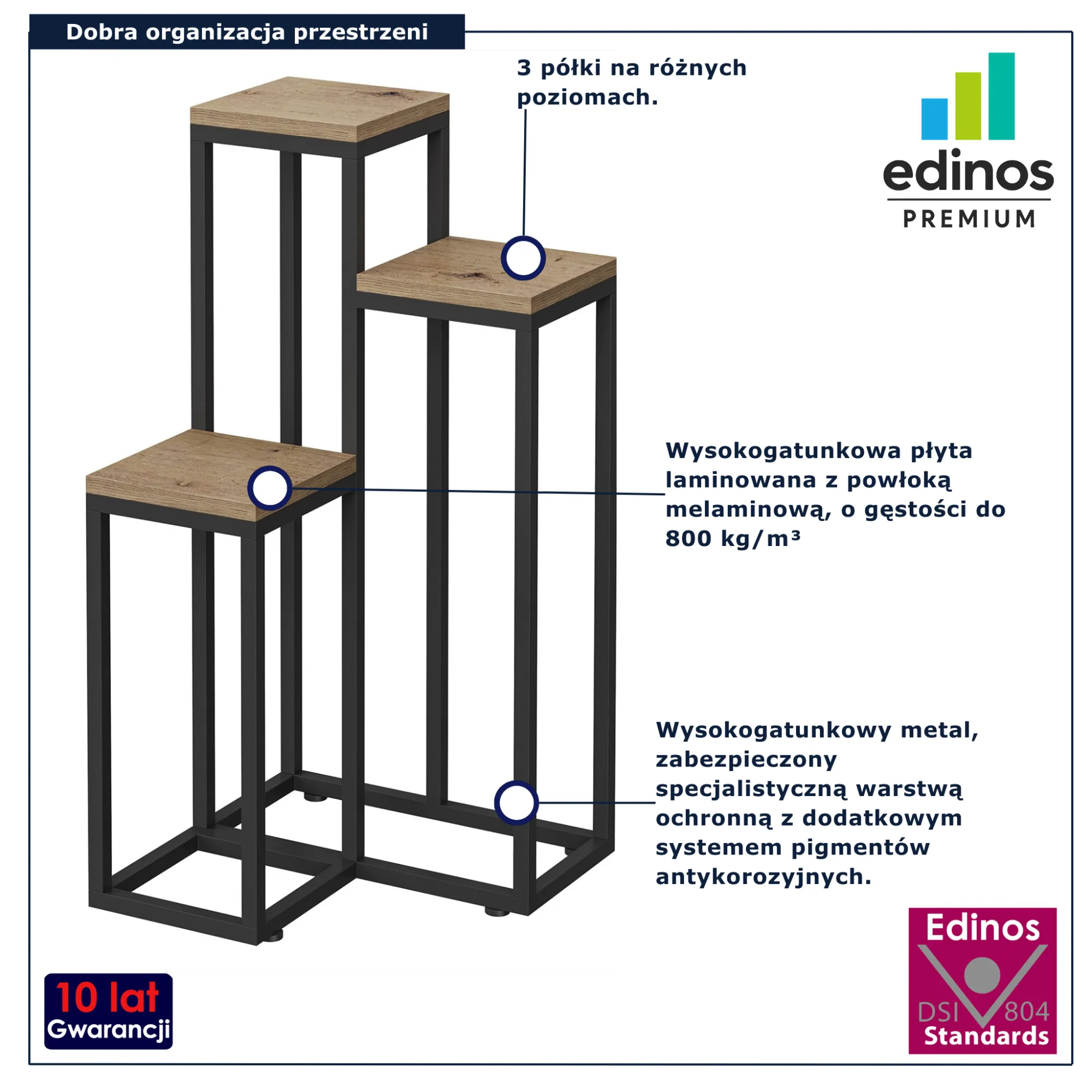 Kwietnik Tocador 13X marki Edinos Premium to efektowny element dekoracyjny, który pozwoli Ci wyeksponować rośliny w elegancki i uporządkowany sposób. Trójstopniowa konstrukcja tworzy dynamiczną, przestrzenną kompozycję, dzięki której każda roślina zyskuje swoje miejsce i odpowiednią ekspozycję. To idealne rozwiązanie zarówno do salonu, sypialni, jak i przedpokoju czy biura. Zróżnicowana wysokość poziomów sprawia, że kompozycja kwiatów nabiera lekkości i głębi. Kwietnik nie tylko organizuje przestrzeń, ale też wprowadza do wnętrza naturalny akcent, podkreślając charakter aranżacji.