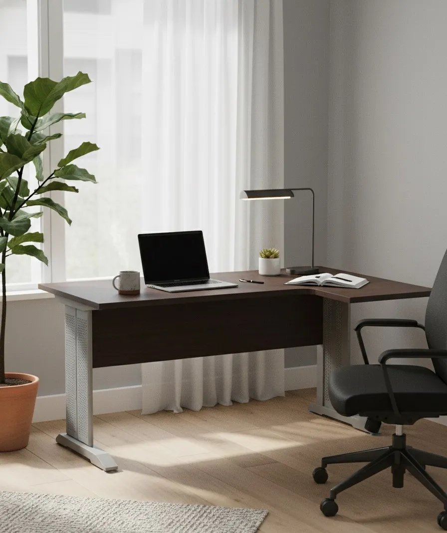 • Nowoczesny design: Biurko narożne z prawostronnym wykończeniem i metalowymi nogami łączy w sobie elegancję i funkcjonalność. Minimalistyczna forma podkreśla współczesny styl, który wzbogaci każde biuro.
