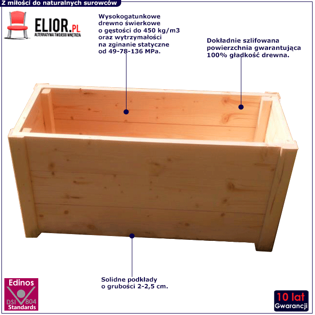Donica ogrodowa Hamir to wspaniały projekt wyróżniający się minimalizmem oraz wyjątkową jakością. Stworzona została pod okiem najlepszych specjalistów, co sprawia, że już na pierwszy rzut oka zaskakuje swoim wykonaniem. Ponieważ drewno to surowiec nie tylko ponadczasowy, ale także niezwykle trwały to właśnie z niego powstała donica. Drewno świerkowe z którego została wykonana donica bezpośrednio po sośnie zajmuje drugie miejsce pod względem wartości użytkowej drewna. Wyróżnia się niezwykłą trwałością oraz łatwością w obróbce. Jest lekkie i miękkie oraz posiada liczne, regularnie rozmieszczone sęki. Jego barwa jest biała, czasem z lekko żółtym odcieniem. Charakteryzuje się także wysoką gęstością do 450 kg/m3 i wytrzymałością na zginanie statyczne od 49-78-136 MPa. Udekoruj swój ogród wspaniałą donicą Hamir i ciesz się niepowtarzalną przestrzenią każdego dnia!