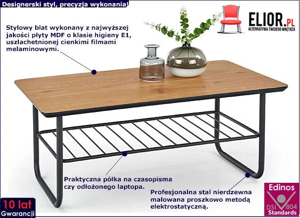 Mamy przyjemność zaprezentować Ci designerską ławę Nexin, która wyróżnia się nie tylko stylem, ale przede wszystkim starannością wykonania. Stolik kawowy Nexin posiada prostokątny blat wykonany z najwyższej jakości laminowanej płyty MDF o klasie higieny E1, uszlachetnionej cienkim filmami melaminowymi. Najwyższa jakość materiałów sprawia, że blat ławy jest niezwykle odporny na wszelkiego rodzaju zarysowania czy uszkodzenia mechaniczne. Rozlane napoje, gorąca kawa, herbata - nie będą dla niej żadnym zagrożeniem i na pewno nie wpłyną na obniżenie jej walorów estetycznych. Jakby tego było mało - oryginalną podstawę stolika wyprodukowano z najlepszej gatunkowo nierdzewnej stali malowanej proszkowo odpornym na zarysowania i zadrapania. Najwyższa jakość techniki polimeryzacji pozwoliła zaoferować firmie Elior aż 10 lat gwarancji na swoje produkty. Już nie musisz się martwić, że po kilku latach część farby odpryśnie od mebla . Prezentowana ława Nexin posiada również funkcjonalny i ozdobny dodatek. Dzięki niezwykle użytecznej półce już nie będziesz miał problemu, gdzie odłożyć pilot od telewizora, ulubioną książkę czy laptopa. Zadbaj o porządek wokół własnej przestrzeni i zainwestuj w mebel, który Ci to zapewni!