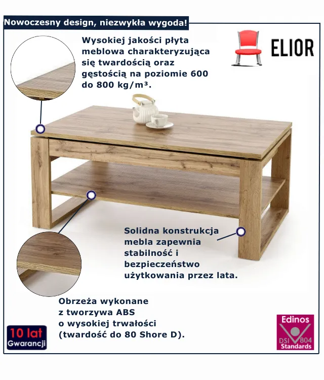 Ława kawowa Enton marki Elior to świetny wybór do każdego nowoczesnego wnętrza, w którym liczy się wygoda i styl — i to bez kompromisów. Dzięki regulowanej wysokości i praktycznej półce, codzienne funkcjonowanie stanie się po prostu łatwiejsze. Niezależnie, czy urządzasz salon od zera, czy szukasz tylko jednego detalu, który zrobi różnicę — Enton Ci to da. A może właśnie brakuje Ci mebla, który dostosuje się do Twojego rytmu dnia? Nie zwlekaj — odkryj ławę kawową Enton marki Elior już teraz w cenie za jedyne 578 zł i przekonaj się, jak wiele może zmienić jeden dobrze dobrany mebel!