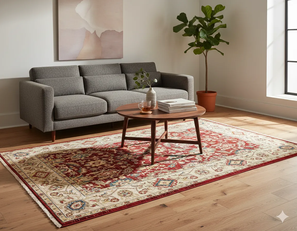 Dywan prezentuje się klasycznie i bardzo elegancko. Czerwony kolor jest głęboki, nie krzykliwy. Materiał przyjemny, łatwo się odkurza. Idealnie pasuje do salonu w tradycyjnym stylu.