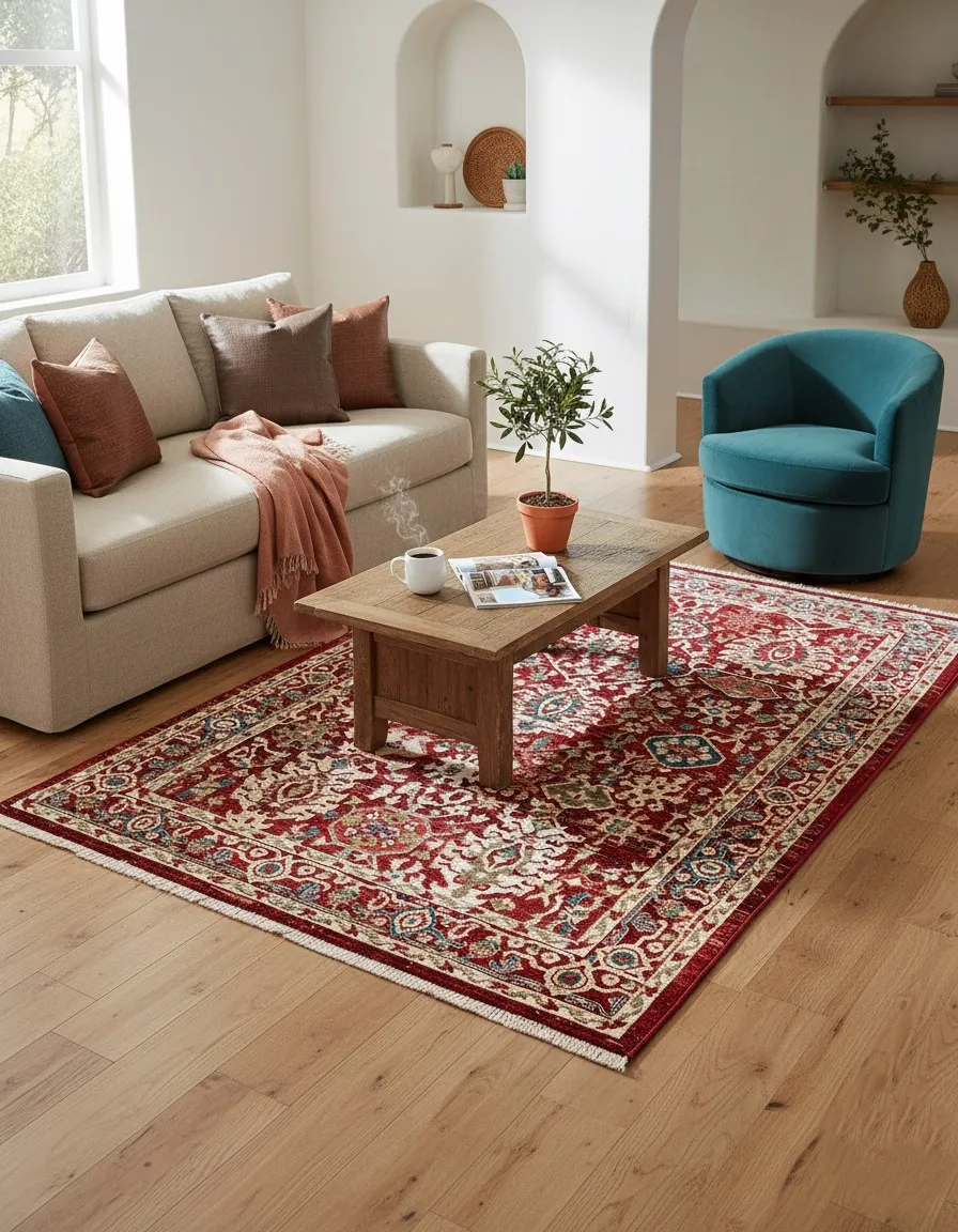 Świetny wybór do salonu, jeśli chcesz od razu dodać mu charakteru czerwień nie dominuje całej przestrzeni, tylko ładnie ją uzupełnia. Dywan sprawia wrażenie solidnego i wykonany jest starannie.