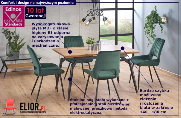 Industrialne meble charakteryzują się solidnym wykonaniem z surowców najwyższej jakości. To one definiują, czy stół będzie wytrzymały, stabilny i funkcjonalny. Z tą myślą do produkcji stołu AUSTIN, wykorzystane zostały najlepsze materiały, utrzymujące się nadal w ramach stylu loftowego. Urzekający blat wykonany jest z profesjonalnej płyty MDF okleinowanej. To naturalna płyta meblowa zbudowana z włókien drzewnych i związków organicznych w warunkach wysokiego ciśnienia i temperatury. Włókna ułożone są różnokierunkowo, o strukturze sinusoidalnej, co zapewnia nadanie jej cech jakościowych oraz wytrzymałościowych. Dodatkowo płyta została uszlachetniona cienkimi filmami melaminowymi w celu zwiększenia jej trwałości. Dla kontrastu i unikatowego wyglądu nogi stołu w kolorze czarnym wykonane są z  profesjonalnej, najwyższej jakości stali nierdzewnej. Dzięki temu, że została pomalowana proszkowo   jest odporna na zarysowania i zadrapania. Najwyższa jakość metody natrysku proszkowego pozwoliła zaoferować firmie Elior aż 10 lat gwar. na swoje produkty. Technika malowania proszkowego charakteryzuje się dużą trwałością, odpornością na korozje, chemikalia, wysoką temperaturę oraz uszkodzenia mechaniczne. Zastosowanie powyższych technik podnosi walory użytkowe i estetyczne mebla. Wybierając zestaw AUSTIN, sprawisz radość sobie, a swojemu wnętrzu dodasz stylu i unikatowego designu.