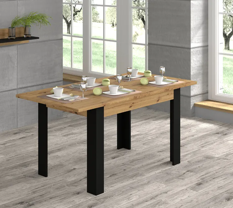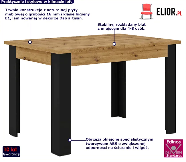 Stół rozkładany Everol 10X to wyjątkowa propozycja marki Edinos Premium skierowana do osób poszukujących trwałych i praktycznych mebli w niesztampowym wydaniu. Mebel wyróżnia się nowoczesną, minimalistyczną formą z szerokim, rozkładanym blatem i dekoracyjnymi, stabilnymi nogami. Kompaktowe rozmiary i pratyczny rozkładany blat doskonale sprawdzą się w każdej, nawet niewielkiej przestrzeni salonu, dając komfortowe miejsce do spożywania posiłków dla 4 - 8 osób. Unikatowe połączenie matowej czerni i blatu w dekorze Dąb artisan to doskonały przepis na niesztampową aranżację salonu, jadalni, kuchni oraz wnętrz komercyjnych w różnorodnych aranżacjach, od industrialnej i minimalistycznej, przez ponadczasową klasykę, aż po klimaty skandynawskie i loft.