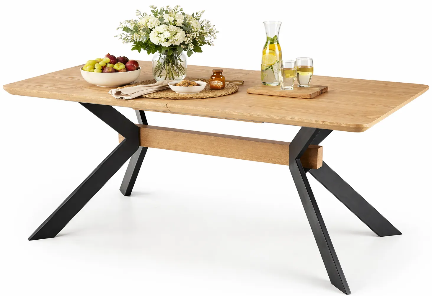 Rozkładany stół Niclos to projekt o nieco modernistycznej formie. Przestrzenny blat w kolorze naturalnego dębu w umiejętny sposób połączony został z czarną podstawą wyróżniającą się niebanalnym układem w kształcie X. Kolorystyka mebla doskonale wpisująca się w dzisiejsze trendy wnętrzarskie bez problemu odnajdzie się we wnętrzach urządzonych w stylu eco, nowoczesnym, industrialnym, a nawet skandynawskim. Stół ten to idealna propozycja nie tylko do salonu, ale także jadalni czy kuchni. Masz dość ciągłego ściskania się przy starym stole podczas niezapowiedzianej wizyty gości? Dzięki Niclos zapomnisz o tym problemie raz na zawsze, a jego wyjątkowa prezencja sprawi, że zwróci on na siebie uwagę absolutnie każdego, kto zawita w Twojej aranżacji!