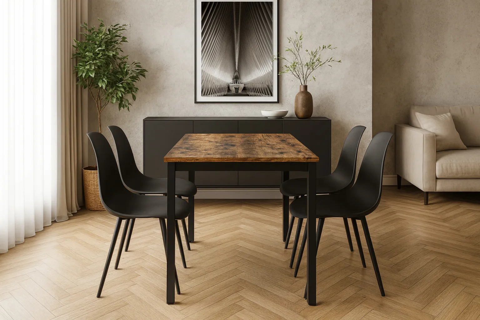 • Ponadczasowy design – klasyczna prostokątna forma stołu i minimalistyczne krzesła idealnie wpisują się w każde wnętrze, od nowoczesnej jadalni po przytulny salon.