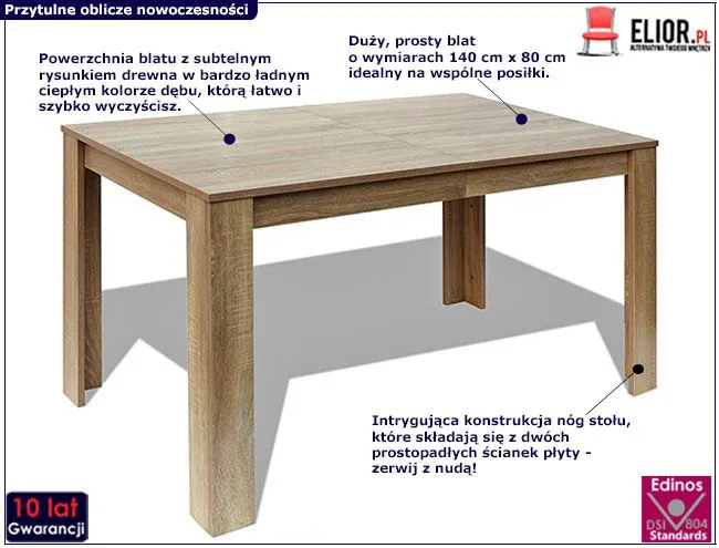 - Symetryczny, prosty kształt i solidny wygląd ocieplony przyjemnym brązem dębu stworzą przytulną atmosferę w jadalni lub kuchni - zobacz też inne nowoczesne stoły w sklepie Edinos.pl - na pewno znajdziesz coś dla siebie!