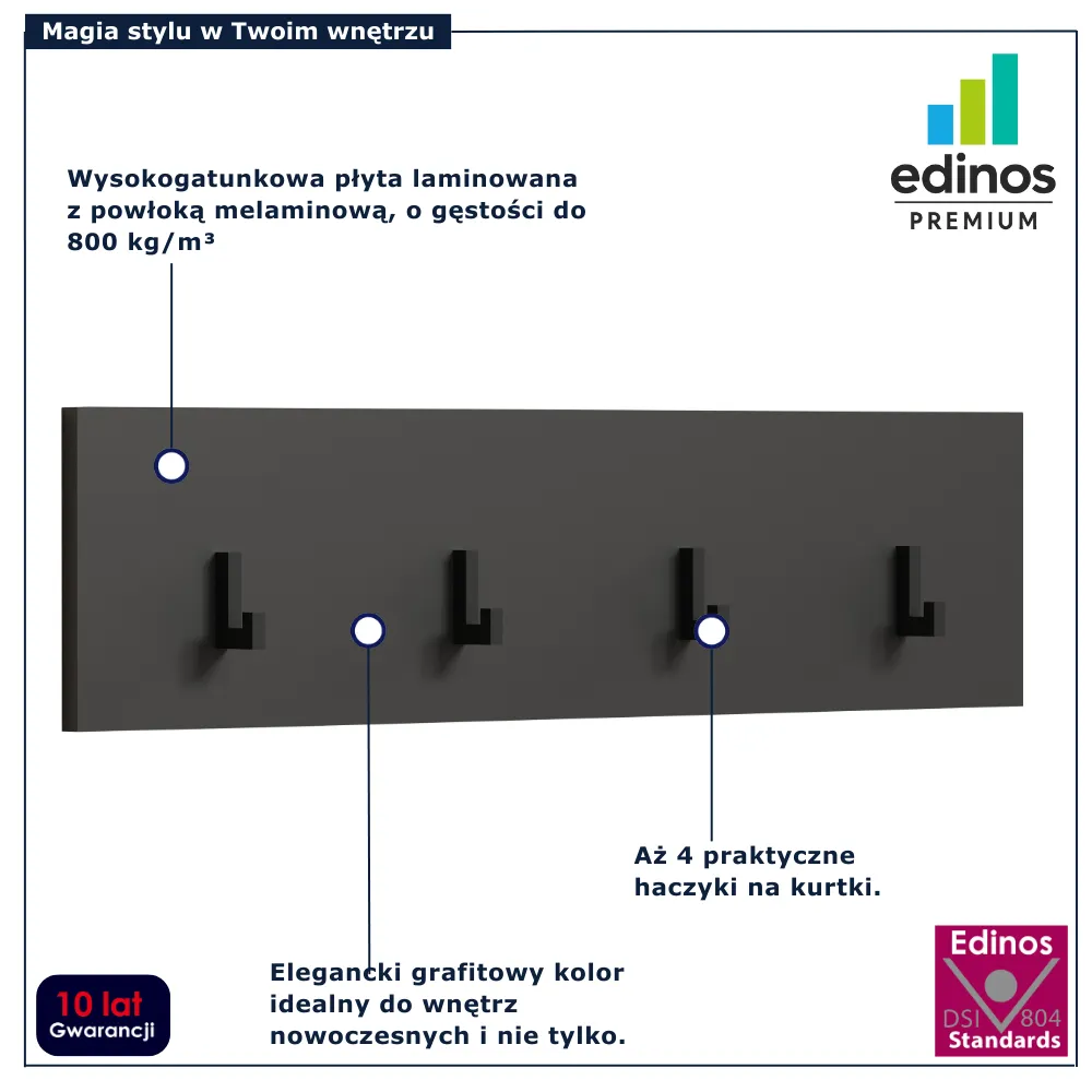 W przedpokoju liczy się prostota, porządek i wygoda, dlatego wieszak ścienny Assoni 12X marki Edinos Premium został zaprojektowany tak, aby w jednej minimalistycznej formie połączyć funkcjonalność z elegancją. Jego jednolity panel w kolorze grafit tworzy spokojne i nowoczesne tło, a cztery czarne haczyki dodają mu charakteru i praktyczności. To idealny wybór dla osób, które chcą zachować czystość i harmonię we wnętrzu bez zbędnych dodatków. Assoni 12X subtelnie wpisuje się w przestrzeń, jednocześnie oferując wygodne miejsce na codzienne okrycia.