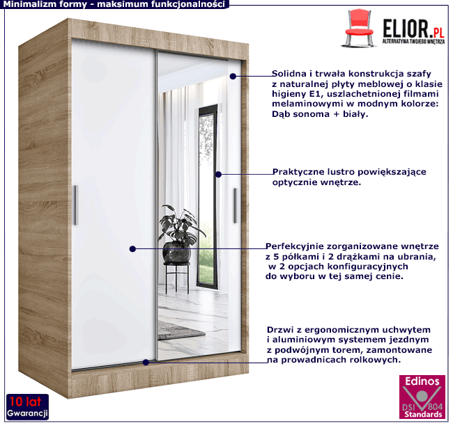 Marka Edinos Premium słynie z produkcji doskonałych jakościowo mebli, które wpisują się w najmodniejsze trendy aranżacyjne. Nasze produkty wykonujemy z ekologicznych i odnawialnych surowców o ustandaryzowanych parametrach technicznych i użytkowych. Szafę przesuwną Palmira 120 3X stworzyliśmy z naturalnej, laminowanej płyty meblowej o grubości 16 mm, o klasie higieny E1. Płyta została uszlachetniona cienkimi filmami melaminowymi, w celu zwiększenia jej trwałości. Zawartość specjalistycznych włókien o strukturze sinusoidalnej, ułożonych różnokierunkowo, dodatkowo nadaje płycie ponadprzeciętnych cech jakościowych. Praktyczne drzwi przesuwne szafy Massi 3X wyposażyliśmy w trwały system jezdny wykonany z metalu oraz specjalistycznych tworzyw sztucznych. Dla zwiększonej trwałości system jezdny zamontowaliśmy na prowadnicach rolkowych oraz podwójnym torze, o wytrzymałości wyższej o ponad 50% od tradycyjnych pojedynczych torów. Precyzyjnie zaprojektowane drzwi przesuwają się całkowicie bezkolizyjnie, nie uderzając o uchwyty. Dodatkowym atutem tak skonstruowanych drzwi jest spora oszczędność przestrzeni, co świetnie sprawdza się w mieszkaniach o niewielkim metrażu. Lustrzana tafla zamontowana na drzwiach frontowych stanowi nie tylko funkcjonalny dodatek, ale nadaje meblowi wizualnej lekkości i wspaniale rozświetla pomieszczenie. Tak zaprojektowana szafa przesuwna Palmira 120 3X marki Edinos Premium to mistrzowski mebel garderobiany, który zachwyci Cię doskonałą jakością i wytworną elegancją.