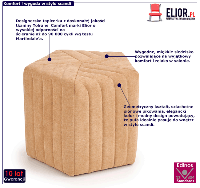 • Modny kolor: tapicerka w eleganckim odcieniu beżu. Kliknij w link i sprawdź także inne pufy w sklepie Edinos.pl. Stwórz swój praktyczny zestaw mebli.
