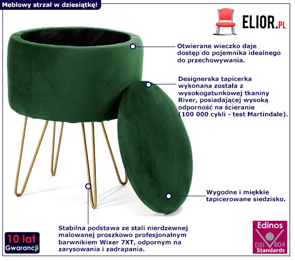 - Modny kolor: butelkowa zieleń. Kliknij w link i sprawdź także inne pufy w sklepie Edinos.pl. Stwórz swój praktyczny zestaw mebli.